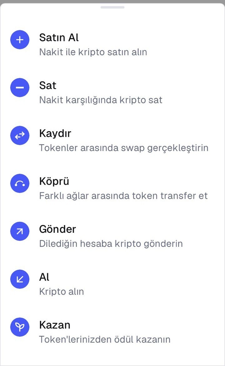 Hesabınızı oluşturduktan sonra, cüzdan arayüzünde bakiyenizi ve portföyünüzü görürsünüz. Daha ayrıntılı bilgi için portföy sekmesine tıklayabilirsiniz. Alt menüde Satın Al, Sat, Swap, Köprü, Gönder ve Al gibi çeşitli işlemleri gerçekleştirebilirsiniz.