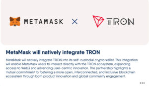 MetaMask, TRON entegrasyonu sayesinde Asya, Avrupa, Güney Amerika ve Afrika’da milyonlarca kullanıcıya ulaşmayı hedefliyor. Tron ağı, günlük 9 milyon işlem hacmi ve 22 milyar doları aşan değer transferi ile MetaMask kullanıcılarına hızlı ve düşük maliyetli işlem deneyimi sunuyor.