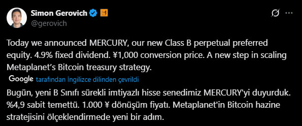 Metaplanet’in çıkaracağı bu yeni imtiyazlı hisseler, yıllık %4,9 sabit temettü sunacak ve tamamen Bitcoin alımlarını finanse etmek için kullanılacak. Şirketin hedefi, Bitcoin’i bilançoda daha büyük bir uzun vadeli stratejik varlık olarak konumlandırmak. Bu finansman modeli, Metaplanet’in hem geleneksel finans araçlarını hem de kripto piyasasının sunduğu yenilikleri bir arada kullanma yaklaşımını yansıtıyor.
