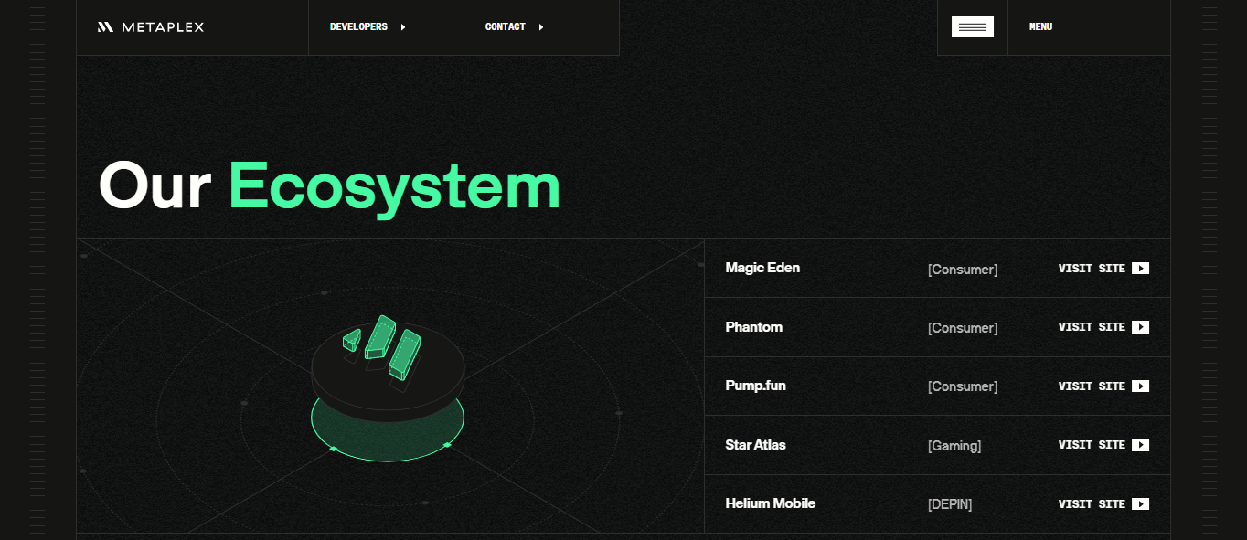 Metaplex’in dört ana bileşeni vardır: Dijital Varlık Standardı (DAS), dijital varlık türleri için şemalar ve davranışlar tanımlar; Metaplex Program Kütüphanesi (MPL), bu standartların Solana üzerinde uygulanmasını sağlar; Metaplex Geliştirici Platformu, SDK’lar ve araçlarla entegrasyonu kolaylaştırır; ve $MPLX token’ı, protokolün yönetim ve yardımcı token’ı olarak işlev görür. Phantom, OpenSea, Magic Eden gibi platformlarla entegre olan Metaplex, Multicoin Capital, Jump Crypto ve Solana Ventures gibi güçlü yatırımcılarla destekleniyor.