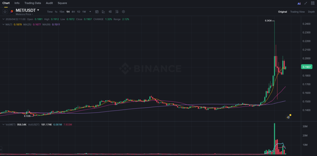 Meteora ($MET) 22 Nisan 2026’de sert bir fiyat hareketiyle piyasanın odağına oturdu. Meteora gün içinde yaklaşık %30’a yaklaşan bir yükseliş kaydederken fiyat $0.14 bandından $0.24 seviyesine kadar geniş bir aralıkta işlem gördü.