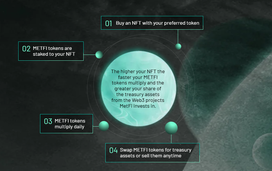 Temel amacı, gelecek vadeden Web3 ve Metaverse girişimlerini tespit etmek, onlara yatırım yapmak ve bu projelerin büyümesinden elde edilen kârı NFT ve token sahipleriyle paylaşmaktır. MetFi, bir yatırımcı, kuluçka merkezi ve topluluk gücünü tek bir yapıda birleştirir.