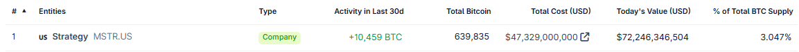 Bugün Strategy, 478.740 BTC ile halka açık şirketler arasında en büyük Bitcoin portföyüne sahip. Bu varlıkların toplam değeri 72 milyar doları aşarken, şirket alımlarından bugüne kadar 15,5 milyar dolar kâr elde etti (Şubat 2025 verilerine göre).