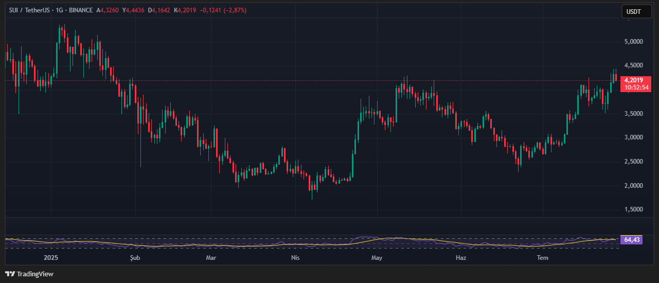 SUI, an itibarıyla 4,20 dolar seviyesinden işlem görüyor ve son 24 saatte yaklaşık %2,70’lik bir değer kaybı yaşadı. Kısa vadeli baskıya rağmen, fiyat hareketleri genel piyasa koşullarıyla paralel bir görünüm sergiliyor.