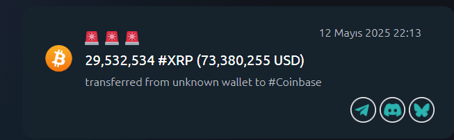 Kripto piyasası hareketli günler yaşıyor. Whale Alert, 12 Mayıs’ta Coinbase’e 29.532.534 XRP’lik dev bir transfer tespit etti. Bu işlem 73.380.255 dolar değerinde. XRP, boğa piyasasının toparlanma döneminde öne çıkıyor. Diğer kripto paralar kırmızıya dönerken, XRP yükseliş trendini koruyor. CoinMarketCap verilerine göre, XRP son 24 saatte %6,87 artarak 2,53 dolarda. Ancak, kısa vadeli yatırımcılar kâr alımlarıyla yükselişi yavaşlatıyor. İşlem hacmi %139 artsa da balina hareketleri dikkat çekiyor.