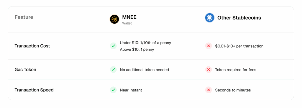 MNEE, yüksek derecede ölçeklenebilir yapısı sayesinde işlemleri son derece hızlı gerçekleştirir ve yüksek hacimli ödemelere uyum sağlar. Ödemeler anlık olarak, 7/24 ve küresel ölçekte kesinleşir. İşlemler için ek bir gas tokeni gerekmez ve maliyetler yalnızca bir kuruş seviyesindedir, bu da kullanıcı dostu ve ekonomik bir deneyim sunar. Ayrıca MNEE, lisanslı bir ihraççı tarafından tamamen teminatlandırılmış ve düzenlenmiş bir stablecoin olarak güvenlik, yasal uyumluluk ve istikrar sağlar.