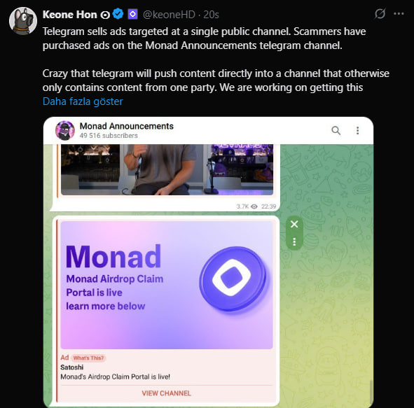 Keone Hon, saldırganların Telegram’ın reklam sistemini manipüle ederek, Monad’ın yalnızca kendi güncellemeleri için ayrılmış resmi kanallarında sahte reklam içerikleri yayınladığını belirtti. Hon, açıklamasında şu ifadeleri kullandı: