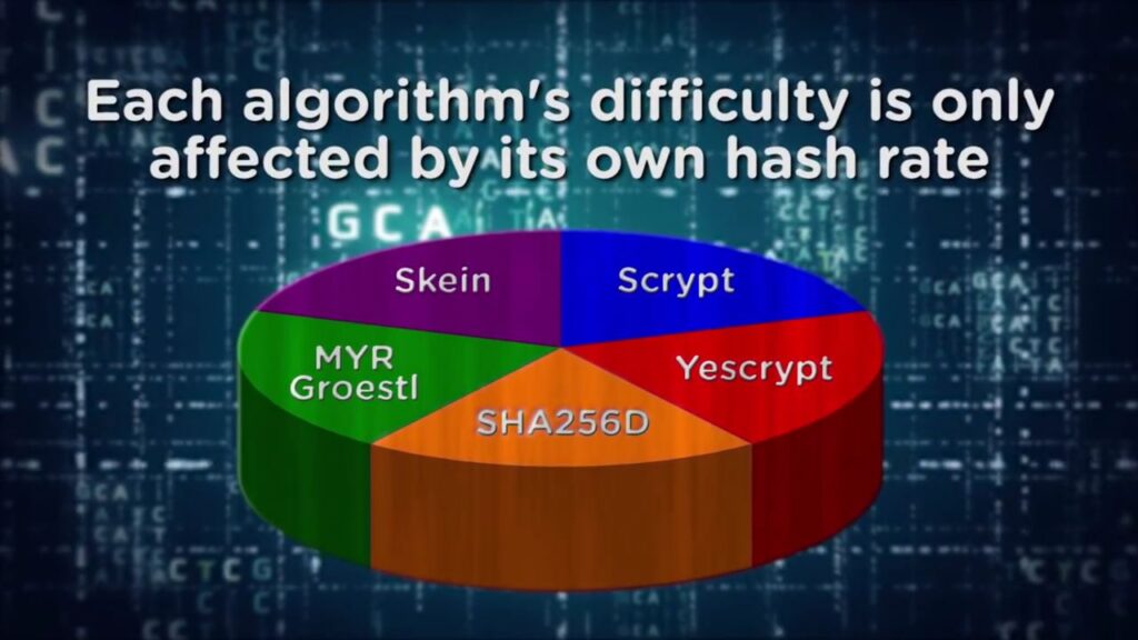 Beş farklı algoritma kullanır: Scrypt, SHA256D, Qubit, Skein, Groestl.