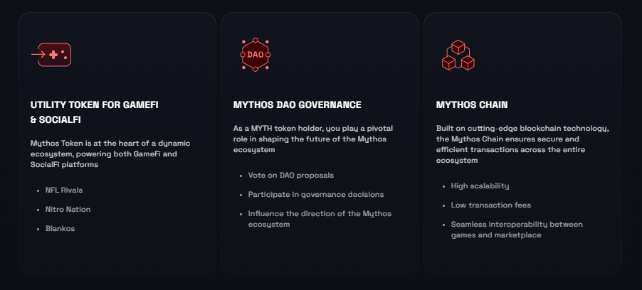 Mythos (MYTH), oyunculara ve içerik oluşturuculara oyun dünyasında gerçek varlık sahipliği ve katılım imkânı sunarak Web3 oyun ekosistemini demokratikleştirmeyi hedefleyen bir blockchain platformudur. Polkadot ağı üzerinde çalışan Mythos Zinciri, yüksek işlem kapasitesi ve düşük ücretlerle güvenli, merkeziyetsiz bir oyun ekonomisi sağlar. MYTH token’ı, bu ekosistemin temel para birimi olarak işlemler, yönetim ve oyunlar arası birlikte çalışabilirlik için kullanılır. NFL Rivals ve Pudgy Party gibi AAA oyunları destekleyen Mythos, oyuncuların dijital varlıklarını NFT olarak alıp satmasına ve oyun içi eylemleri gerçekleştirmesine olanak tanır.