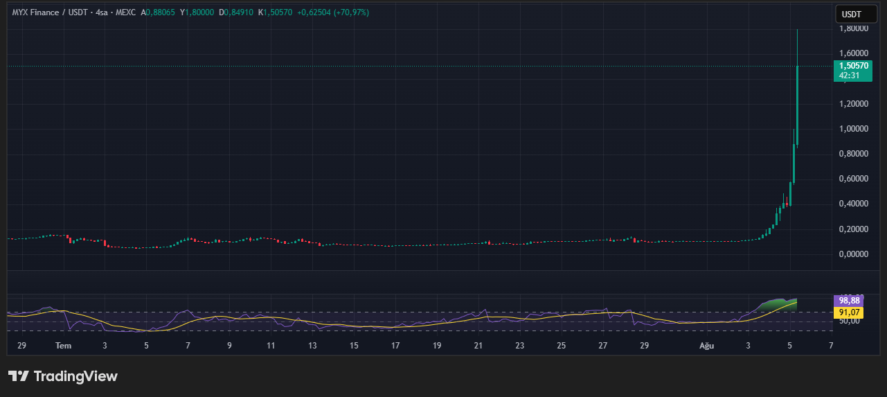Son günlerde kripto para piyasasında dikkatleri üzerine çeken bir token var: MYX Finance (MYX). Üç gün içinde %950 gibi inanılmaz bir yükseliş sergileyen $MYX, 4 Ağustos Pazartesi günü tek bir günde %200’ün üzerinde artış gösterdi. Bu yükselişin arkasında herhangi bir resmi açıklama ya da büyük bir listeleme haberi bulunmaması, gözleri tamamen piyasadaki spekülatif alım baskısına çevirdi.