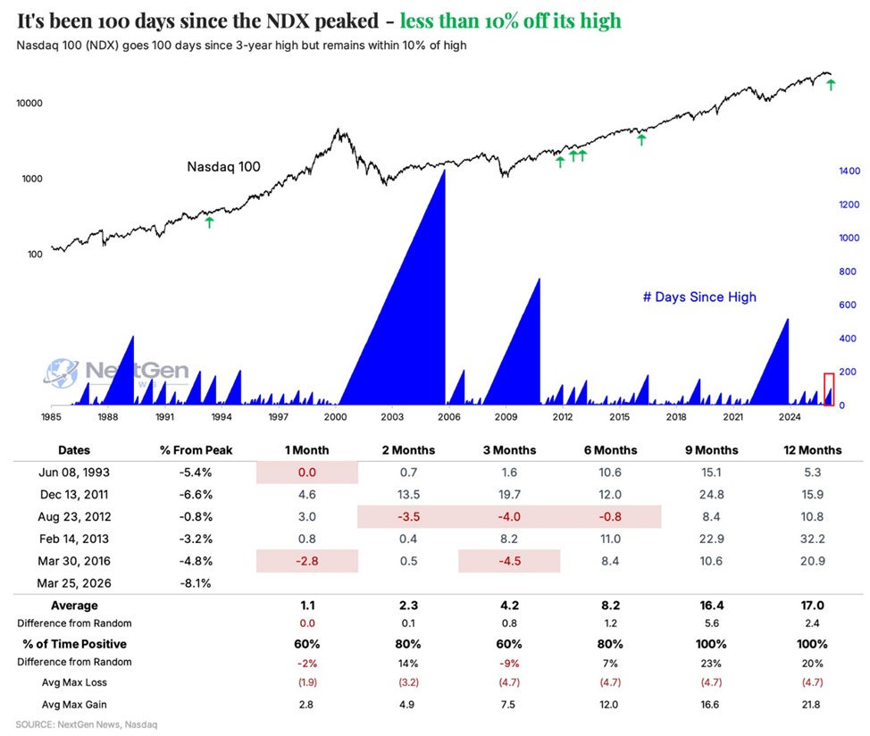 Nasdaq-100 endeksi tam 100 işlem günüdür tüm zamanların zirvesinin altında işlem görüyor. Bu durum 2023’ten bu yana en uzun seri. Ancak tarihsel veriler ilginç bir tablo ortaya koyuyor: benzer piyasa kurulumlarında teknoloji ağırlıklı endeksin çoğu zaman toparlandığı görülüyor.
