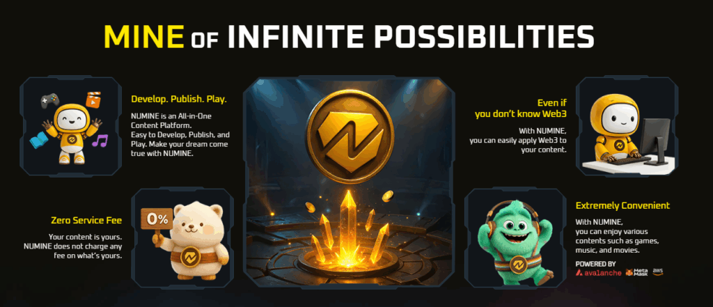 NUMINE, Web 3.0 içerik platformu olarak hizmet veren, hem bir zincir hem de ekosistem işlevi gören bir platformdur. İçerik geliştiriciler ve kullanıcılar, NUMINE aracılığıyla sektörün yönünü birlikte şekillendirebilir. NUMINE, blockchain tabanlı oyunların geliştirilmesini, dağıtımını ve oynanmasını kolaylaştırmak için tasarlanmış entegre bir blockchain oyun platformudur. Amaç, blockchain oyunları alanındaki yüksek giriş engellerini azaltmak ve hem geliştiriciler hem de kullanıcılar için tek bir çatı altında kapsamlı hizmetler sunmaktır.