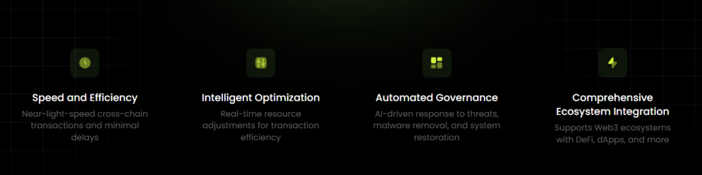 oooo, beyin işlevini üstlenen Omnipresent Intelligence ile ağdaki tüm hareketleri izleyip en iyi kararları alırken, Network Layer zincirler arası iletişim ve akıllı köprüleri yönetir. AI Optimization Layer, kaynak dağılımını dinamik olarak ayarlayıp işlemleri optimize ederken, Data Layer piyasa verilerini toplar ve zincirler arası senkronizasyonu sağlar. Kullanıcıyla etkileşimin gerçekleştiği Application Layer DeFi, NFT ve diğer dApp’leri kapsar, Security Layer ise merkeziyetsiz yönetişim ve risk kontrol mekanizmaları ile tüm sistemi güvence altına alır. Security Layer, yönetişim ve risk kontrolünü kapsayacak şekilde tasarlanmıştır; bu katmanın gerçek etkinliği ise zincir üstü stres senaryolarında netleşecektir.