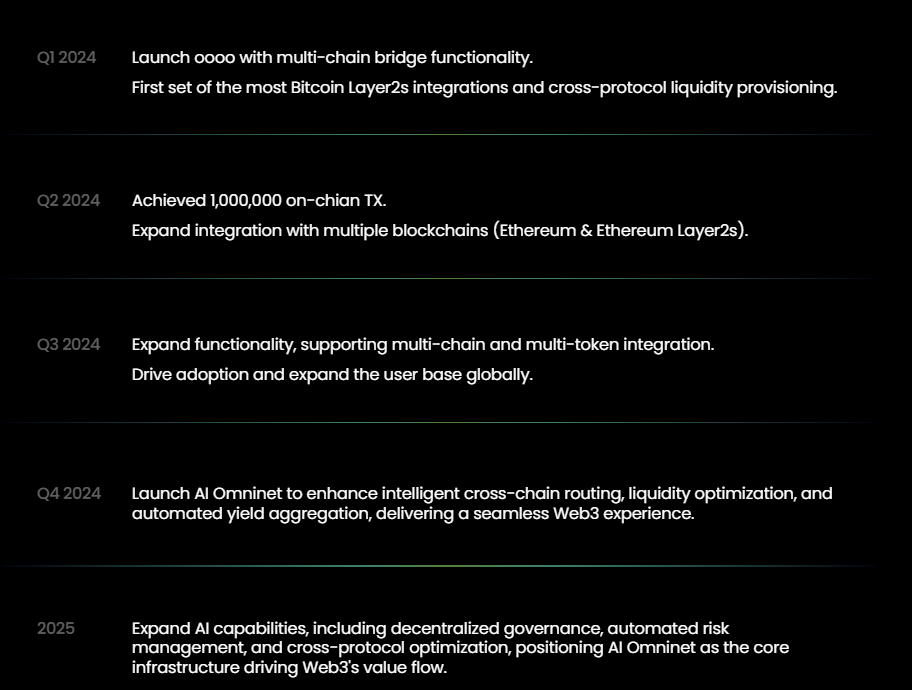 Bu yapı, projenin hedeflenen ekosistem konumlandırmasını özetlemektedir. oooo, Bitcoin merkezli çok zincirli iletişim ve AI destekli otomasyon fikrini tek bir mimaride birleştirmeyi hedefleyen bir altyapı projesi olarak konumlanmaktadır. Mimari vaatler net biçimde tanımlanmış olsa da, modelin sürdürülebilirliği ve ölçeklenebilirliği, entegrasyonların canlı kullanım verileriyle birlikte şekillenecektir.