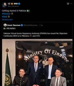 Binance’in kurucusu ve eski CEO’su Changpeng Zhao (CZ), Pakistan Sanal Varlıklar Düzenleme Kurumu’nun (PVARA) verdiği NOC onayının ardından sürece ilişkin kısa bir değerlendirmede bulundu. CZ, Pakistan’daki bu gelişmeni: