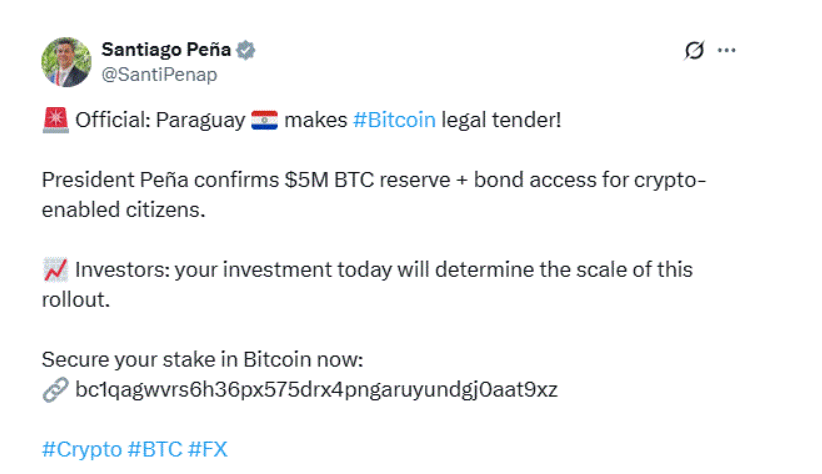 Paraguay Devlet Başkanı Santiago Pena’nın X hesabı 9 Haziran 2025’te hacklendi. Hesaptan sahte bir duyuru yapıldı. Bu duyuruda Paraguay’ın Bitcoin’i yasal para birimi olarak kabul ettiği iddia edildi. Ayrıca, ülkenin bir Bitcoin rezervi oluşturacağı ve Bitcoin tahvilleri çıkaracağı açıklandı. Hatta Hacker’lar, yatırımcılardan belirli bir Bitcoin cüzdanına bağış yapmalarını istedi.