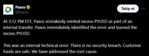 “Paxos hatayı hemen fark etti ve fazla basılan PYUSD’leri yakarak sorunu giderdi. Herhangi bir güvenlik ihlali yaşanmadı, müşteri fonları güvende.”