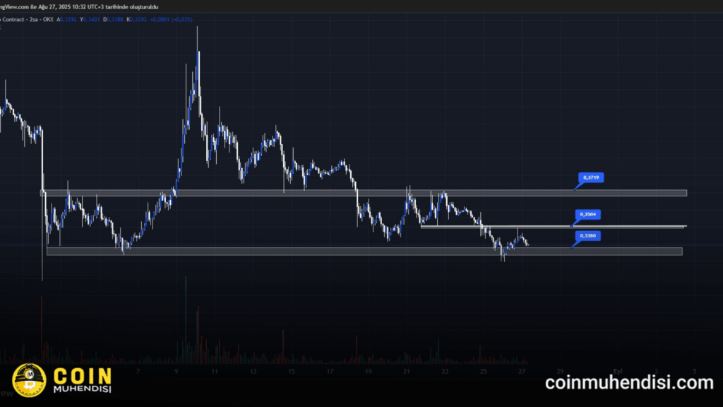 Önündeki ilk direnç noktası 0,35$ seviyesinde bulunuyor. Bu bölge, henüz yeni bir dip oluşturmadığı için güçlü bir direnç sayılmaz; ancak burayı aşması halinde bir sonraki önemli direnç seviyesi olan 0,37$ gündeme geliyor. Bu seviyenin kırılması, fiyatın 0,50$ seviyelerine kadar yükselmesini mümkün kılabilir. Fiyat hareketleri, temel haber akışıyla paralel ilerliyor. Pozitif gelişmelerin gelmesi durumunda momentumun güçlenmesi ve yükselişin hızlanması beklenebilir.
