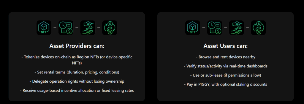 • RWA Vurgusu: Her cihaz/istasyon tokenize edilebilir, NFT ile mülkiyet/gelir paylaşımı.