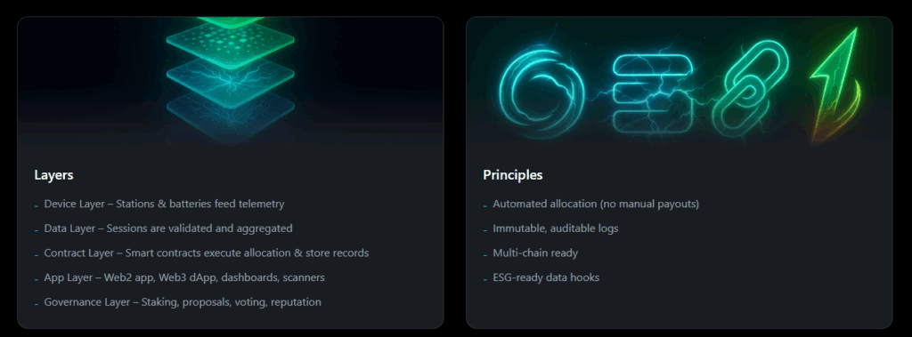 • Amaca dönük bir RWA altyapısı: şarj cihazlarını/istasyonları on-chain varlıklar haline getirip, NFT’ler ve staking ile mülkiyet/ödül mekanikleri kurmak.