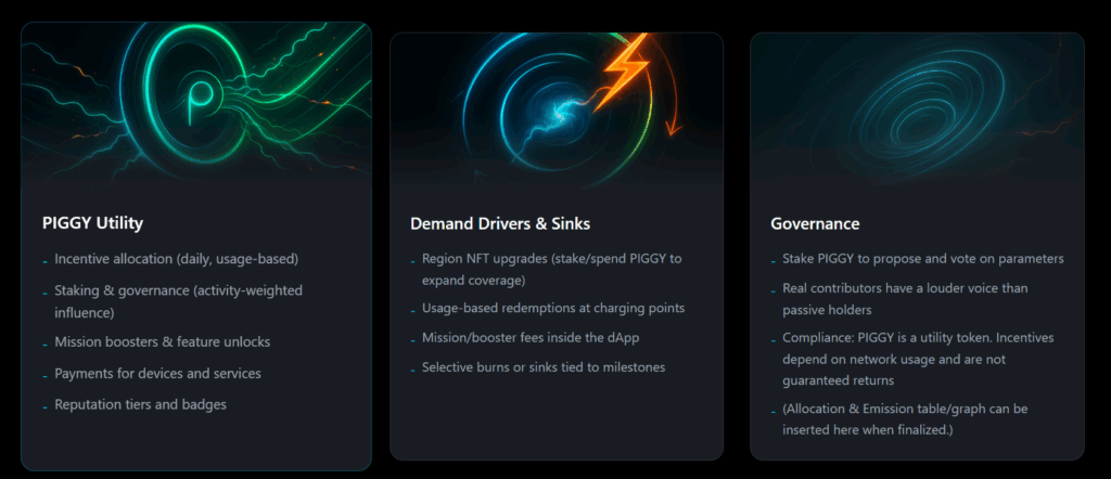 PIGGY, “kazan–stake et–yönet–öde” döngüsünü destekleyerek hem bireysel kullanıcıları hem de enerji sağlayıcılarını ödüllendiren, kullanıma dayalı bir token ekonomisi oluşturur.