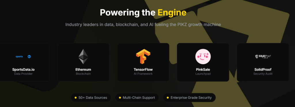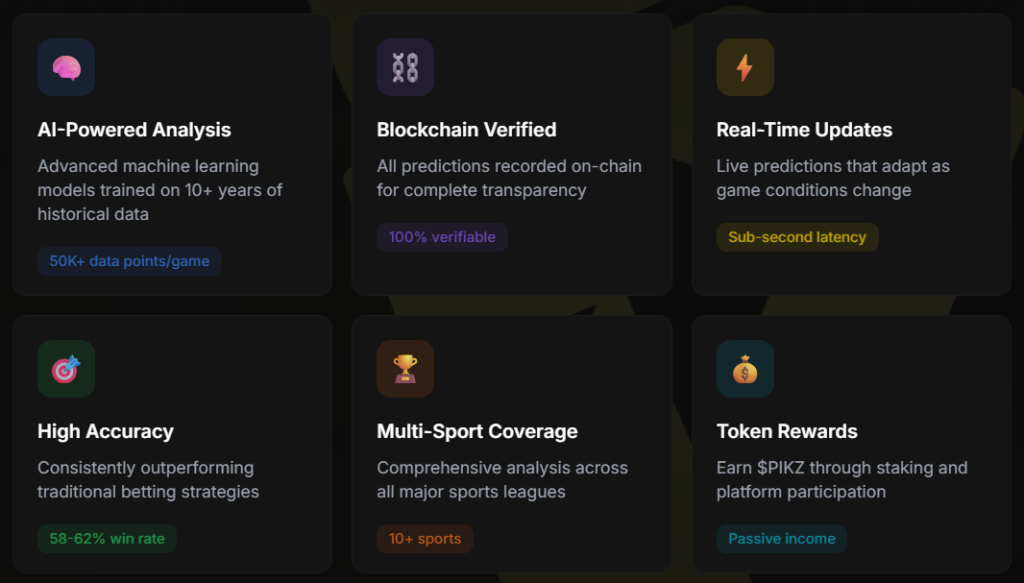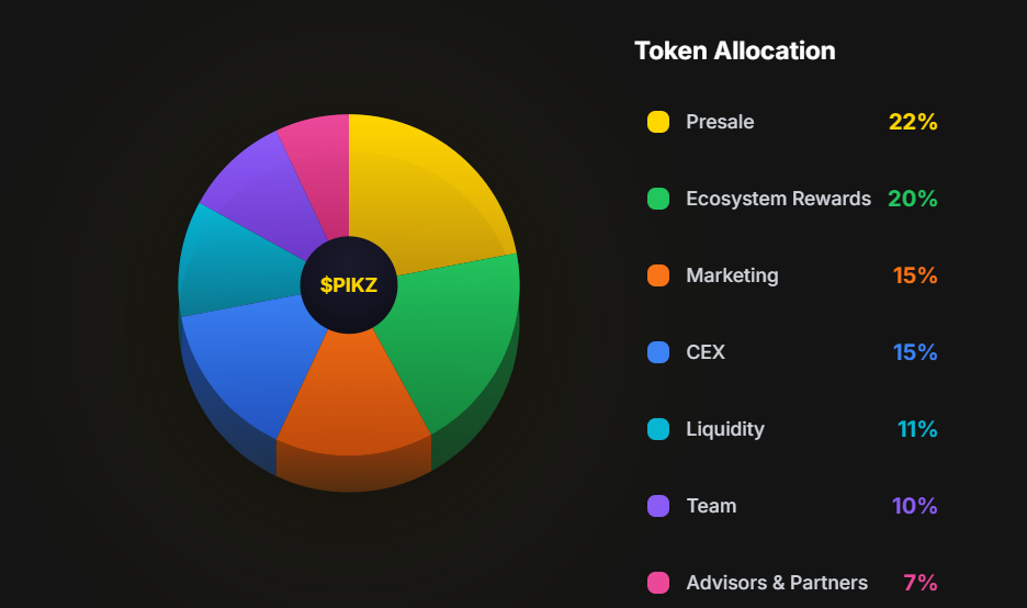 Platformun $PIKZ tokeni, kullanıcıların premium tahminlere erişmesini, platform yönetimine katılmasını ve staking yoluyla pasif gelir elde etmesini sağlar. Tüm tahminler zincir üzerinde kayıtlıdır; böylece şeffaflık ve doğrulanabilir performans takibi garanti edilir.