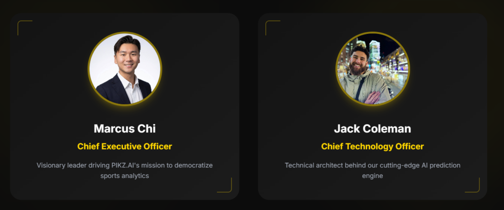 Marcus Chi (CEO): PIKZ.ai’nin kurucu lideri olan Marcus Chi, spor analitiğini demokratikleştirme misyonuyla projeye yön vermektedir. Stratejik vizyonuyla, platformun geniş kitlelere ulaşmasını sağlayan ana itici güçtür.