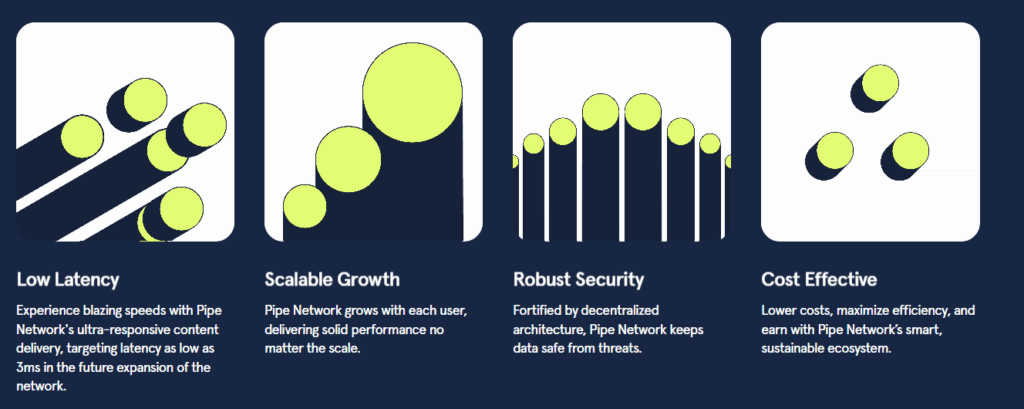 Özetle, Pipe Network projesi, Solana’nın hız ve düşük maliyet avantajlarını kullanarak CDN, depolama ve AI hizmetlerini merkezi olmayan ve ultra-düşük gecikmeli bir altyapıda sunmayı amaçlayan iddialı bir girişimdir. Güçlü bir teknik geçmişe sahip ekibi ve Multicoin Capital gibi önemli bir yatırımcısı, projenin potansiyelini desteklemektedir.