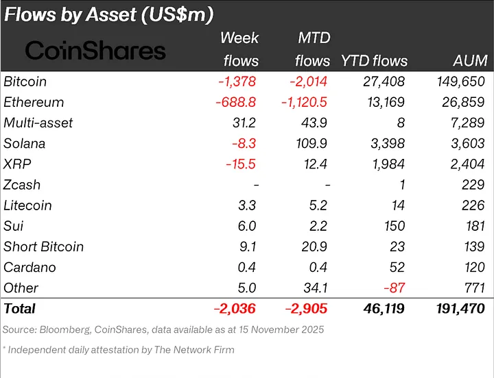 Kripto piyasasında geçtiğimiz hafta yaşanan sert satış dalgası, dijital varlık fonlarını da derinden etkiledi. Üç haftadır devam eden çıkış trendi, son düşüşlerle birlikte hız kazandı ve fonlardan toplamda 2 milyar dolarlık net sermaye çıkışı yaşandı. Bu büyüklükte bir satış, şubat ayında başlayan tarife krizi döneminden bu yana kaydedilmemişti. Ancak piyasa geneline yayılan olumsuz havaya rağmen iki altcoin fonu dikkat çekici şekilde yatırım toplamayı başardı.