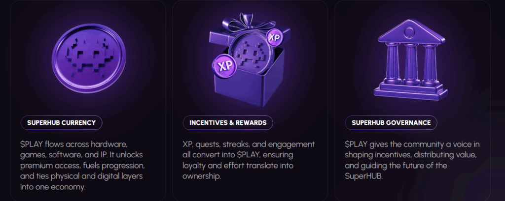 $PLAY tokenı, SuperHUB’un ekonomi, ödül ve yönetişim katmanı olarak işlev görür. Kullanıcılar, $PLAY ile oyun içi ilerlemeyi destekleyebilir, görev ve etkinlikler üzerinden ödüller kazanabilir ve SuperHUB’un geleceğini şekillendiren yönetişim süreçlerine katılabilir.