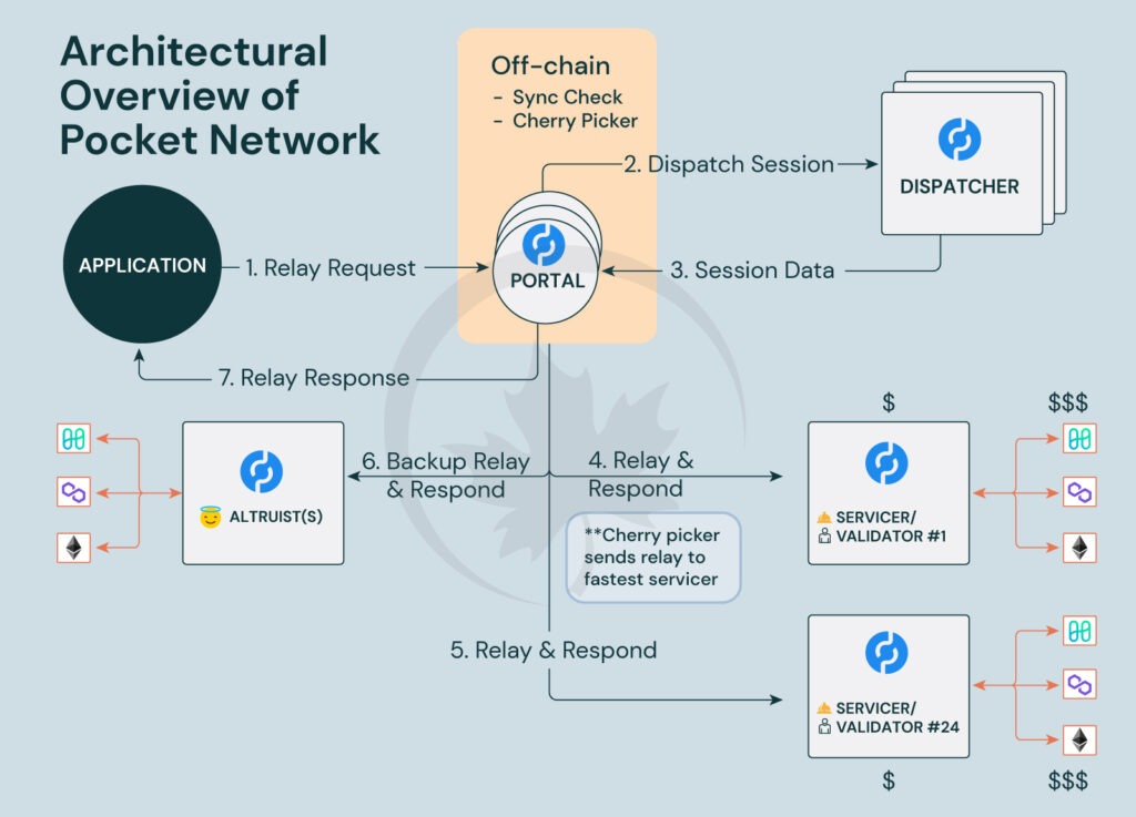 POKT protokolü, blockchain RPC’leri (Uzaktan Prosedür Çağrısı) sunmak için merkeziyetsiz bir düğüm operatörleri ağını teşvik ederek ve koordine ederek çalışır. Bu sayede, uygulamalar 50’den fazla farklı blockchain ve Katman-2 ağıyla etkileşim kurabilir. Her veri isteği (röle), Dispatcher düğümleri tarafından uygun node’lara yönlendirilir ve en hızlı ve güvenilir node isteğe yanıt verir, böylece ağ hataya karşı dayanıklı ve verimli çalışır.