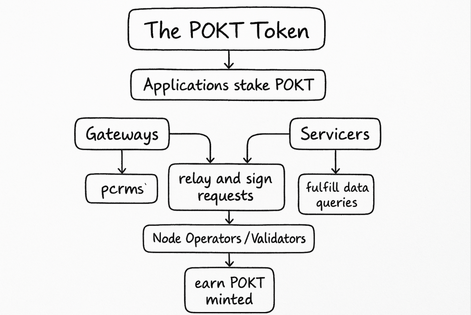 POKT token’ı, ekosistemdeki tüm ekonomik faaliyetleri yönlendiren ve katılımcılar arasındaki ilişkiyi kuran temel bir araçtır. Aşağıdaki şema, token’ın bir değer döngüsü içinde nasıl işlediğini göstermektedir