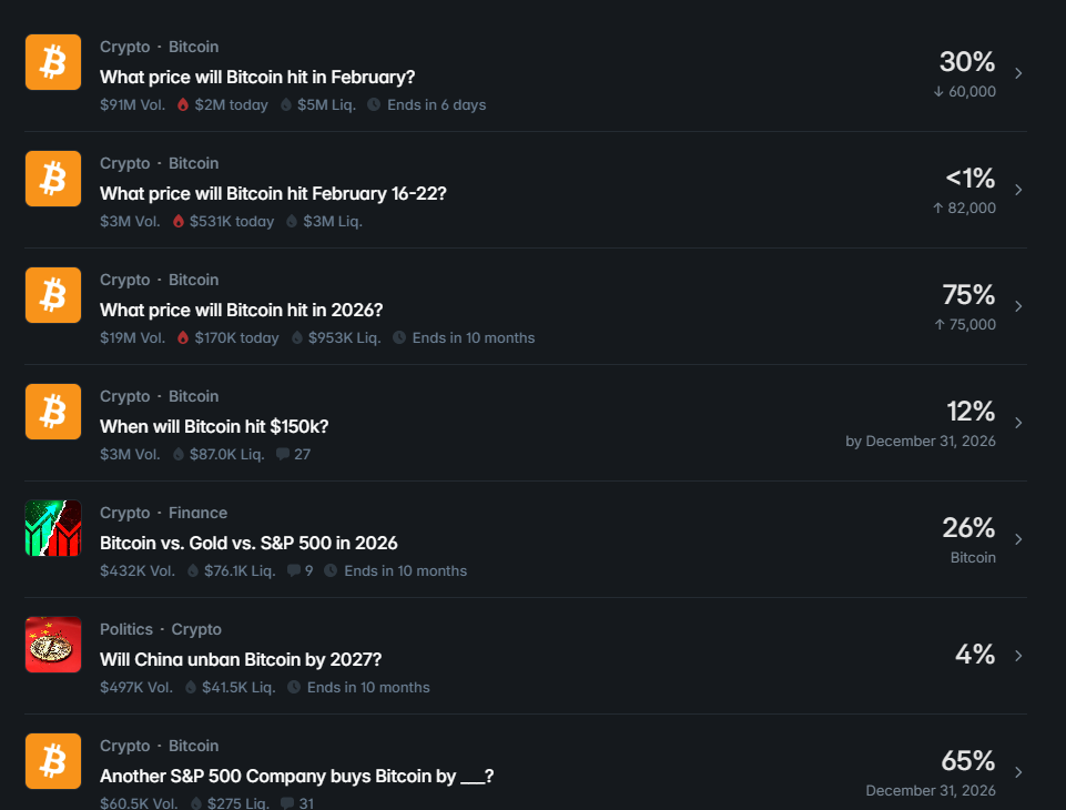 Şubat ayının en popüler senaryosu hâlâ 75.000 dolar üzeri. Polymarket’te bu pozisyon için 88 milyon doları aşan işlem hacmi birikmiş durumda. Ama gerçekleşme olasılığı %50’nin altına gerilemiş. Yani insanlar yatırıyor, fakat güven biraz sarsılmış durumda.
