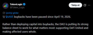Öte yandan TokenLogic tarafından sunulan yeni teklif, AAVE geri alım programının geçici olarak askıya alınmasını öngörüyor. Paylaşılan detaylara göre geri alımların 19 Nisan 2026 itibarıyla zaten durdurulduğu ve bu kararın resmi olarak topluluk oylamasına sunulacağı ifade edildi. Oylamanın ise 28 Nisan 2026 tarihinde başlaması planlanırken, bu süreçte DAO hazinesinin daha esnek kullanılmasının hedeflendiği belirtiliyor.
