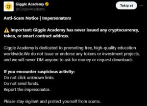 Giggle Academy, sosyal medya hesapları üzerinden yaptığı açıklamada, kendilerini taklit eden kişiler tarafından sahte token projeleri oluşturulduğunu belirtti.