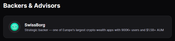 Proje, kripto varlık yönetimi alanında önemli oyunculardan biri olan SwissBorg tarafından desteklenmektedir. Bu destek, projenin kurumsal güvenilirliğini artıran önemli bir faktördür.