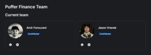 • Amir Forouzani – Contributor Puffer Finance ekosistemine teknik katkı sağlayan geliştiricilerden biridir. Protokol altyapısının geliştirilmesi, validator sistemleri ve likit restaking mekanizmasının iyileştirilmesi gibi alanlarda çalışmalara katkıda bulunmaktadır. Aynı zamanda ekosistemin büyümesine yönelik teknik geliştirmelerde rol aldığı bilinmektedir.