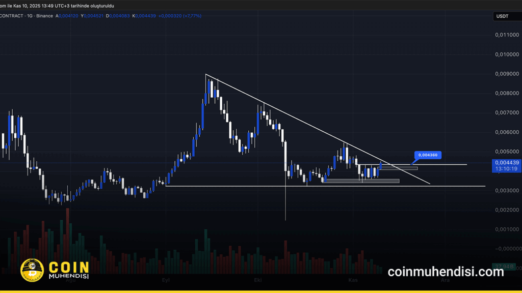 ATH seviyesini yaptıktan sonra piyasanın genel geri çekilmesiyle birlikte düşüş yaşayan $PUMP, hareketin başladığı 0.003250$ seviyesinin altında kapanış yapmayarak bu bölgeyi korumayı başardı. Ardından birkaç gün boyunca 0.004360$ seviyesinin altında birikim yapan $PUMP, şu anda bu bölgeyi yeniden kazandığı izlenimini veriyor.Eğer fiyat bu seviyenin üzerinde kapanış yapar ve kalıcılık sağlarsa, bu bölgeyi destek konumuna çevirmesi beklenebilir. Aynı zamanda, ATH seviyesinden başlayan düşen trend çizgisine temas etmesine de oldukça az kaldı.Bu iki seviyeyi aynı anda kazanması halinde, $PUMP için yeni bir yükseliş dönemi başlama potansiyeli oldukça yüksek görünüyor.