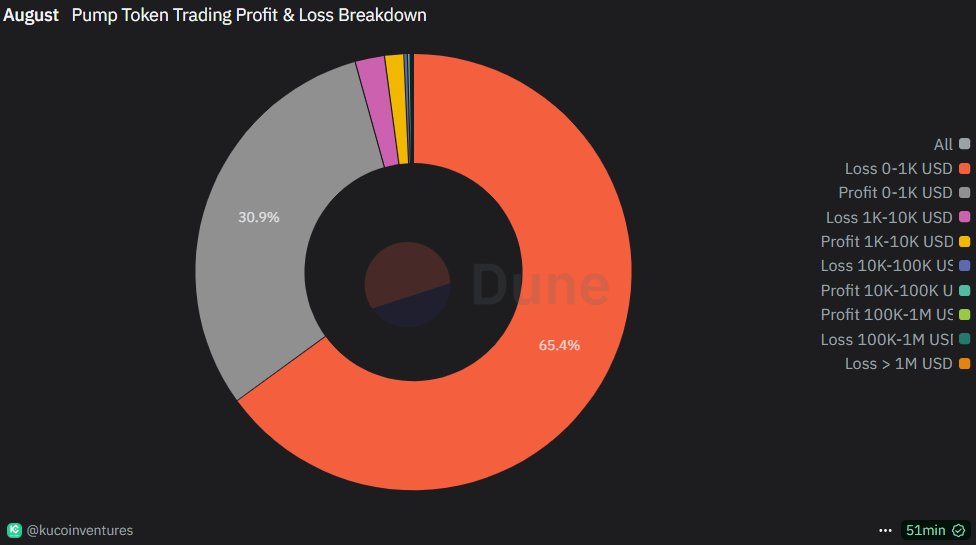 Yaklaşık 1,35 milyon adres token işlemlerini aktif olarak sürdürdü ancak çoğu yatırımcı kâr elde edemedi. Yatırımcıların %60’ından fazlası ayı zararla ayı kapattı ve tek bir kişi dahi bir milyon doların üzerinde kazanç sağlayamadı. Adreslerin %65,4’ü veya 882.000 cüzdan 0–1.000 dolar arasında kayıp yaşadı, cüzdan başına ortalama zarar 73,41 dolardı. Bu grup tek başına 64 milyon doları aşkın zarara sebep oldu.