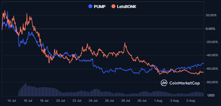 6 Ağustos itibarıyla Pumpfun’ın 24 saatlik işlem hacmi 469.67 milyon dolar seviyesine ulaşarak LetsBonk’un 464.91 milyon dolarlık hacmini geride bıraktı. Bu veri, özellikle son haftalarda yaşanan artan kullanıcı ilgisinin somut bir göstergesi.