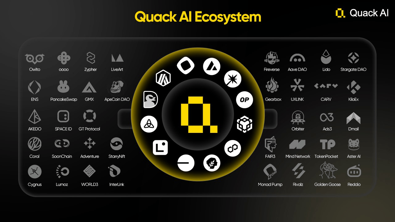 Quack.AI, BNB Chain, Base, Arbitrum, Linea, Avalanche, Metis, Taiko ve DuckChain gibi birden fazla blok zinciri ekosistemiyle uyumludur. Bu zincirler arası işlevsellik, merkeziyetsiz özerk organizasyonların (DAO’lar) ve diğer yönetişim temelli sistemlerin farklı altyapılarda tutarlı süreçler yürütmesini sağlar.