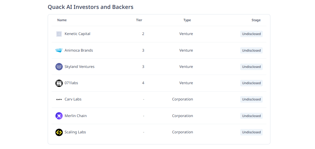 Quack.AI, Animoca Brands, DWF Ventures, Kenetic Capital, Skyland Ventures, 071Labs, Scaling Labs, CARV Labs ve Merlin Chain gibi blok zinciri ve teknoloji sektörlerinden yatırımcılar tarafından desteklenmektedir.