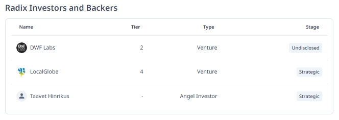 Radix, DWF Labs, LocalGlobe ve Taavet Hinrikus gibi önemli yatırımcılar ve destekçiler tarafından desteklenmektedir. Bu ortaklar, Radix’in küresel DeFi platformu vizyonunu güçlendirmek için stratejik ve finansal katkı sağlar.