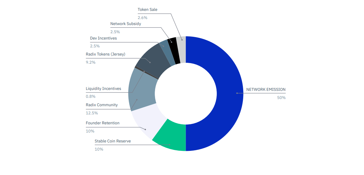 Başlangıçta 4,41 milyar E-RADIX token’ı ve 7,59 milyar kilitli XRD token’ı oluşturulmuştur. Kilitli token’lar kurucular, ağ sübvansiyonu, geliştirici teşvikleri ve stabil koin rezervi için ayrılmıştır.