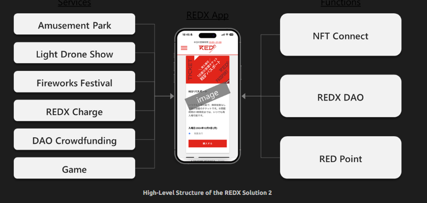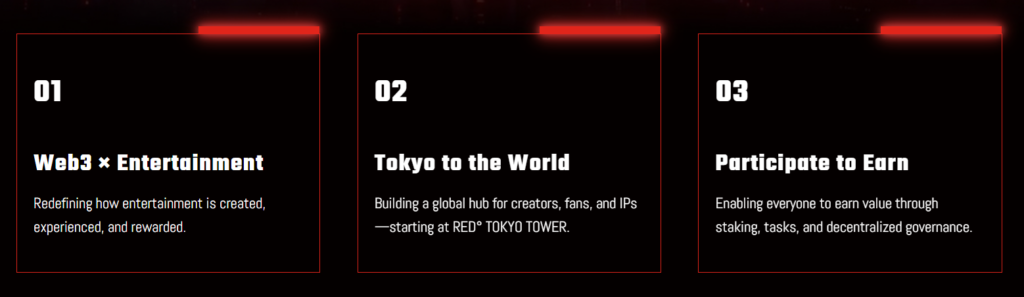 REDX, Web3 teknolojisini kullanarak yenilikçi eğlence deneyimleri yaratmayı ve sürdürülebilir bir küresel eğlence ekonomisi inşa etmeyi amaçlayan bir projedir. Projenin merkezi Tokyo Tower’da bulunan RED° TOKYO TOWER olarak belirlenmiştir. Burada hayranlar, içerik üreticileri, yatırımcılar ve iş ortakları bir araya gelir.