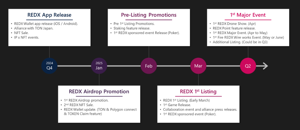 2024 Q4: REDX Wallet yayınlandı, TON Japan ile iş birliği kuruldu, ilk NFT satışları ve etkinlikler başladı.