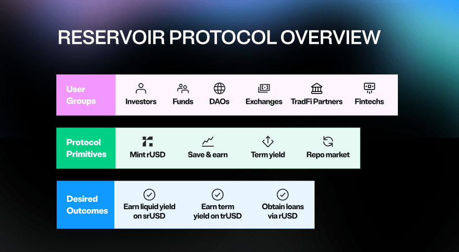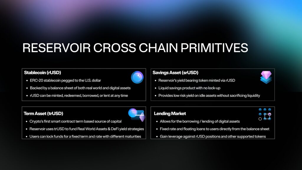 Reservoir, merkeziyetsiz, ölçeklenebilir ve verimli bir stabil kripto para protokolü olarak tasarlanmıştır. Amaç, dijital ve gerçek dünya varlıklarıyla desteklenen yeni nesil stablecoin’ler aracılığıyla yatırımcılara güvenli ve tutarlı getiri sağlamaktır. Stablecoin ekosisteminde istikrar, merkeziyetsizlik ve sermaye verimliliğini bir arada sunmayı hedefler.