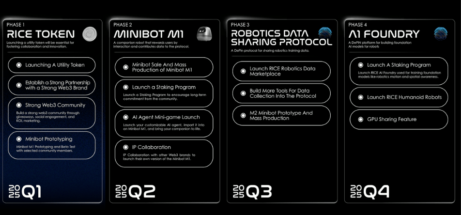 - 2025 Q1 – RICE Token: Utility token lansmanı, topluluk oluşturma, M1 minibot prototip ve beta test.
