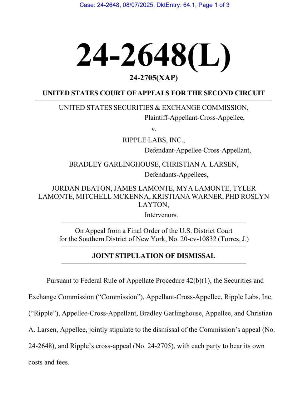 Ripple ve ABD Menkul Kıymetler ve Borsa Komisyonu (SEC), yaklaşık beş yıldır süren hukuk mücadelesini sonlandırdı. Taraflar, karşılıklı olarak temyiz başvurularını geri çekerek davayı resmi olarak bitirdiklerini duyurdu. SEC ve Ripple davasında tarafların yaptığı temyiz iptali başvurusuyla, yaklaşık beş yıllık hukuki süreç resmen sona erdi.
