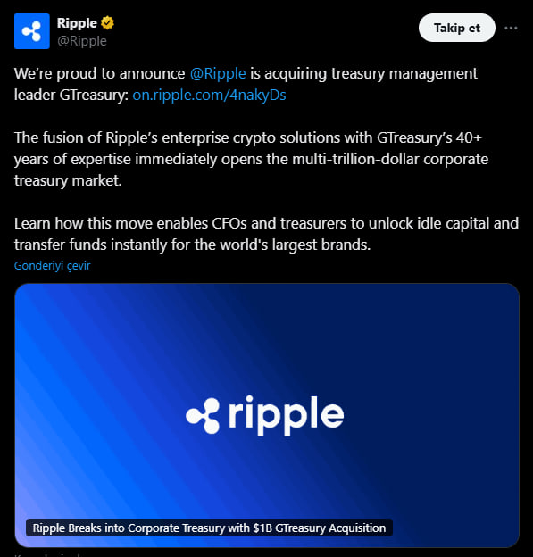 GTreasury, dünyanın dört bir yanındaki çok uluslu şirketlere likidite, nakit yönetimi ve döviz işlemleri çözümleri sunan önemli bir hazine yönetimi platformudur. Ripple, bu satın almayla birlikte CFO’lar, saymanlar ve büyük finans departmanlarıyla doğrudan etkileşim kurarak dijital ödeme altyapısını gerçek ekonomiye taşıyacak.